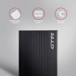 A bordázott alumínium ház használata hozzájárul a hatékony hűtéshez és a meghajtó védelméhez, míg a gumi lábak stabilitást biztosítanak a felületen. Az elegáns dizájn emellett megakadályozza a nem kívánt ujjlenyomatokat.