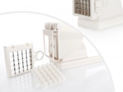 A éles fém pengékből álló rács azonos darabokra vágja a burgonyát, tökéletes eredményt adva sütéshez és olajban sütéshez is.
