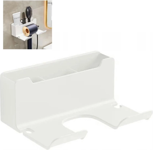 Fehér hajszárító tartó falra egy kiváló megoldás a helytakarékosságra a fürdőszobájában. A felszerelése könnyű és nem invazív a kétoldalas ragasztószalag használatának köszönhetően. Praktikus kiegészítő tágas rekesszel apróságok számára, és két horonnyal a kábel számára.