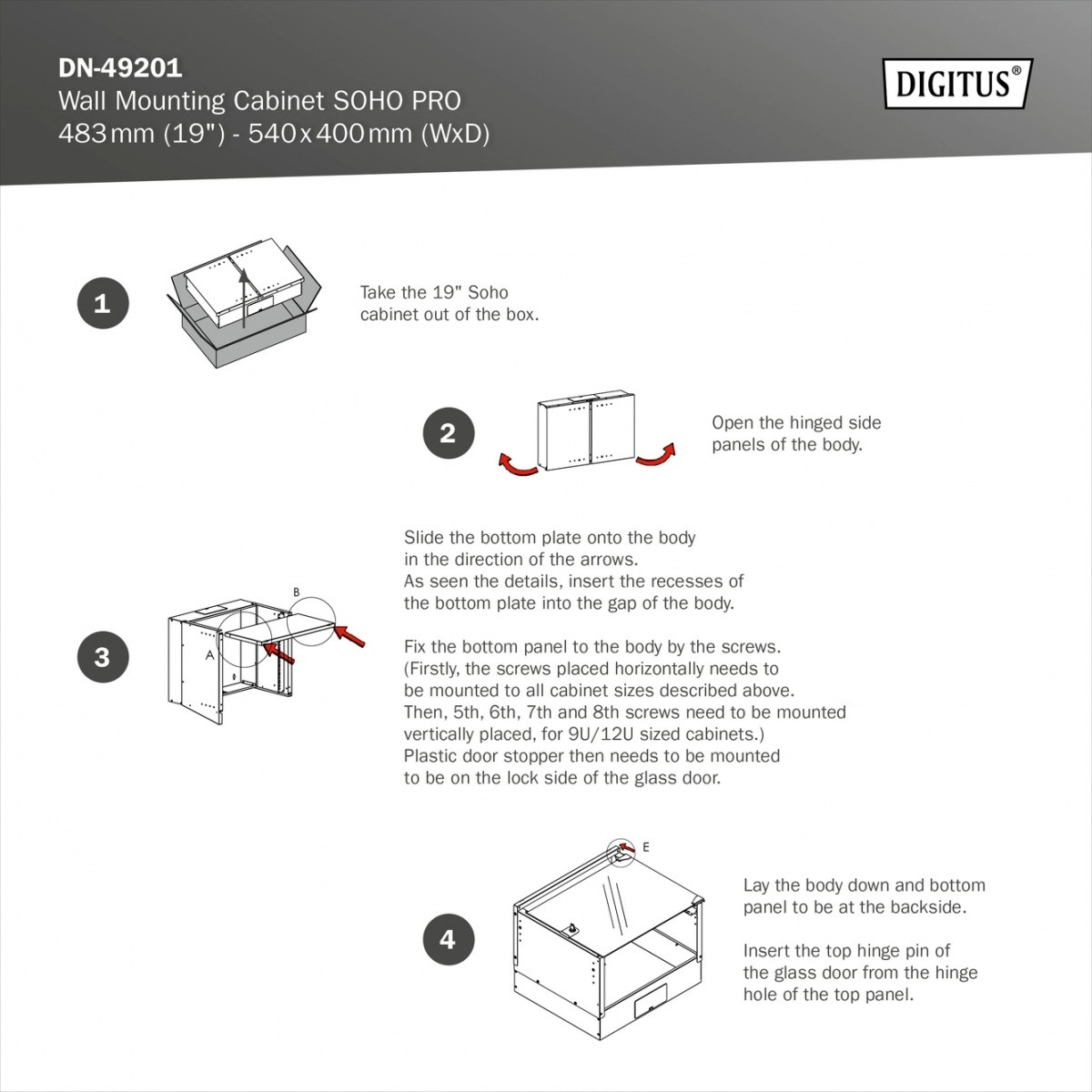 Fali 19" hálózati szekrény 4U SOHO PRO, 240 × 540 × 400 mm, üvegajtó, 60 kg teherbírás, fekete