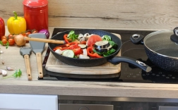 A serpenyő minden tűzhelytípushoz alkalmas, beleértve a gáz-, indukciós és kerámia főzőlapokat. A SOFT TOUCH típusú ergonomikus nyél mindig hűvös tapintású, és kényelmes kezelést biztosít.