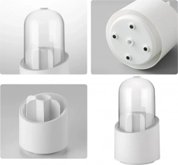 A kupolaszerű fedél megvédi a kozmetikumokat a szennyeződésektől, miközben átláthatóvá teszi a tartalmat.