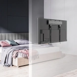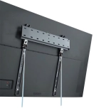 A tartó közel húzza a tévét a falhoz a letisztult, modern megjelenésért, miközben a robusztus fémkeret stabil megtámasztást biztosít.