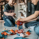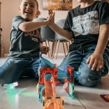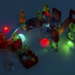A színes, világító golyók és a reflektorok beragyogják a pályát, és minden építményt látványos élménnyé varázsolnak. Ideális félhomályban való játékhoz és a gyerekek alkotókedvének fokozásához.