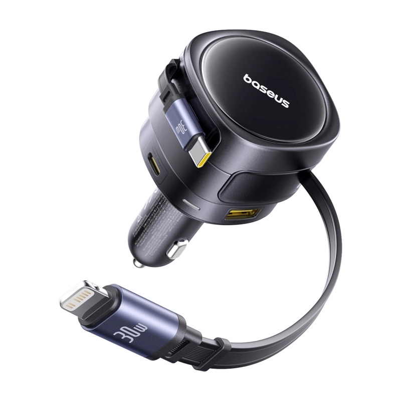 A Baseus autós töltő lehetőséget kínál négy eszköz egyidejű töltésére, két beépített kábellel (USB-C és Lightning) és további két porttal (USB-C és USB-A).