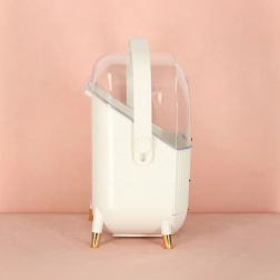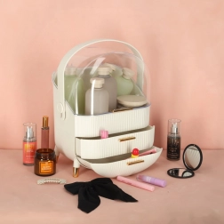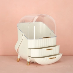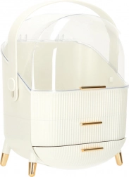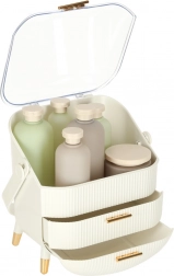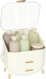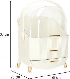 Bemutatjuk a fehér kozmetikai rendezőt fiókokkal, amely segít rendet tartani a kozmetikai termékei és ékszerei között. Ez a rendező két tágas fiókkal és áttetsző fedéllel van felszerelve, amely védi a dolgait a portól, és közben szépen kiállítja azokat. Az elegáns forma arany részletekkel luxus megjelenést kölcsönöz minden fürdőszobának vagy toalettasztalnak.