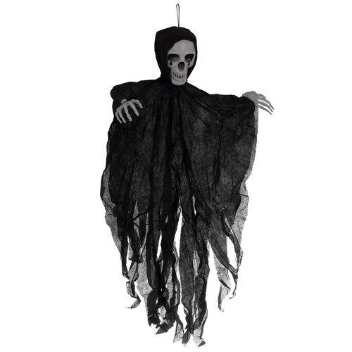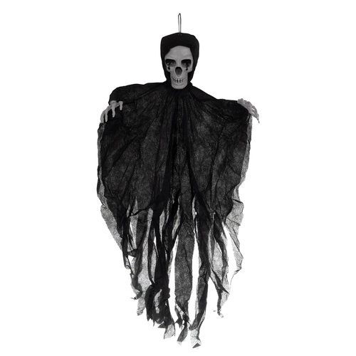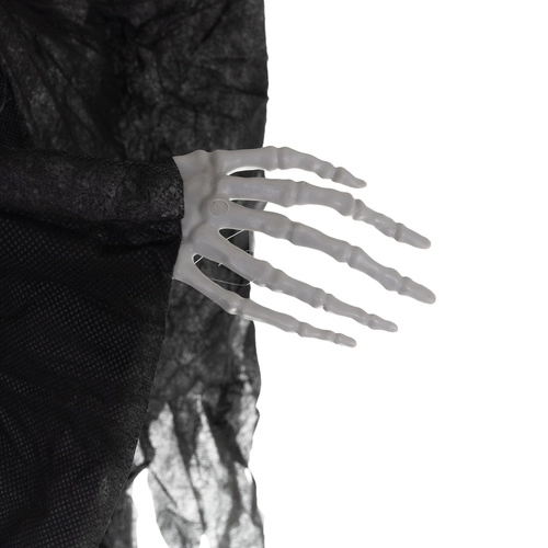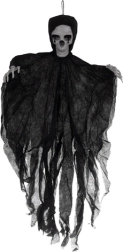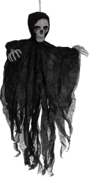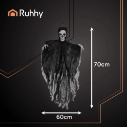 Realista, függeszthető csontváz tépett anyaggal, amely azonnal hátborzongató hangulatot teremt. Könnyű szerkezet és akasztófül a könnyű felhelyezéshez – mennyezetre, ajtóra, lámpára vagy kültéri előtető alá. A szélben mozgó textil lebegő kísértet hatást kelt, a 70 cm-es méret pedig feltűnő központi díszítőelemmé teszi. Ideális Halloweenre, tematikus bulikra és díszletezéshez.