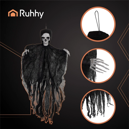 Alkoss hatásos halloweeni jelenetet pillanatok alatt. A fekete RUHHY függő csontváz élethű megjelenést, alacsony tömeget és egyszerű felakasztást akasztófüllel kínál. A tépett textil a légmozgásra lágyan hullámzik, fokozva a félelmetes hatást.