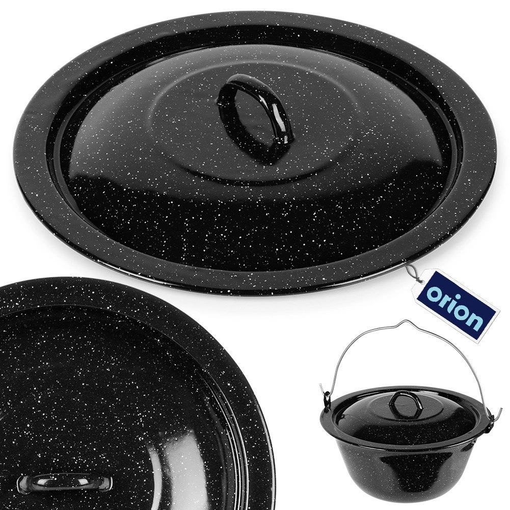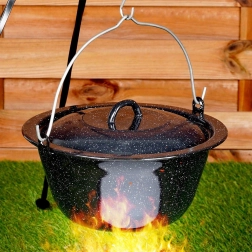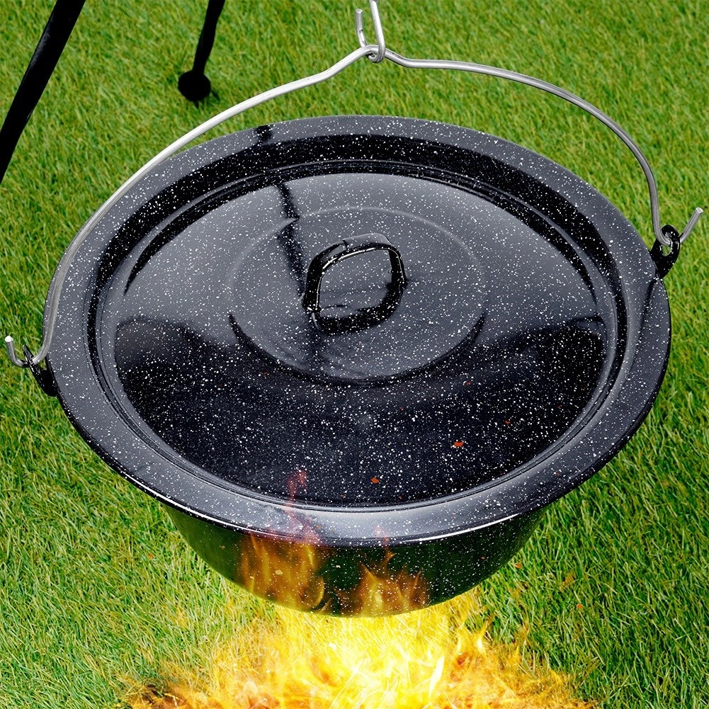 A fekete zománc védi a korrózióval és a karcolásokkal szemben, higiénikus és könnyen tisztítható – ideális rendszeres kültéri főzéshez.