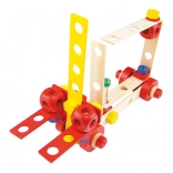 Tömör fa, tartós alkatrészek és biztonságos csavaros rögzítés – ideális a 3 éves kortól ajánlott kis építőknek.