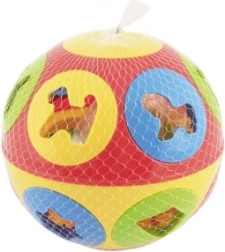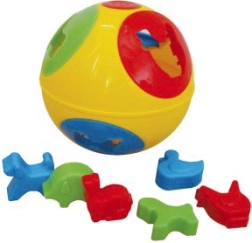 Szórakoztató műanyag bedobó játék labda formában, 13 cm átmérővel, amely fejleszti a finommotorikát, a mozgáskoordinációt és a forma-felismerést. 6 állatfigurás formát tartalmaz, és ideális 12 hónapos kortól. Elérhető két színváltozatban.