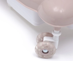 A háromfokozatú magasságállítás révén a járássegítő a gyermek aktuális igényeihez igazítható. Az elülső 360°-ban forgó szilikon kerekek egyenletes mozgást és padlókímélő használatot biztosítanak, a hátsó gumírozott fix kerekek növelik a stabilitást. A speciális felborulásgátló rendszer további biztonsági réteget nyújt.