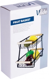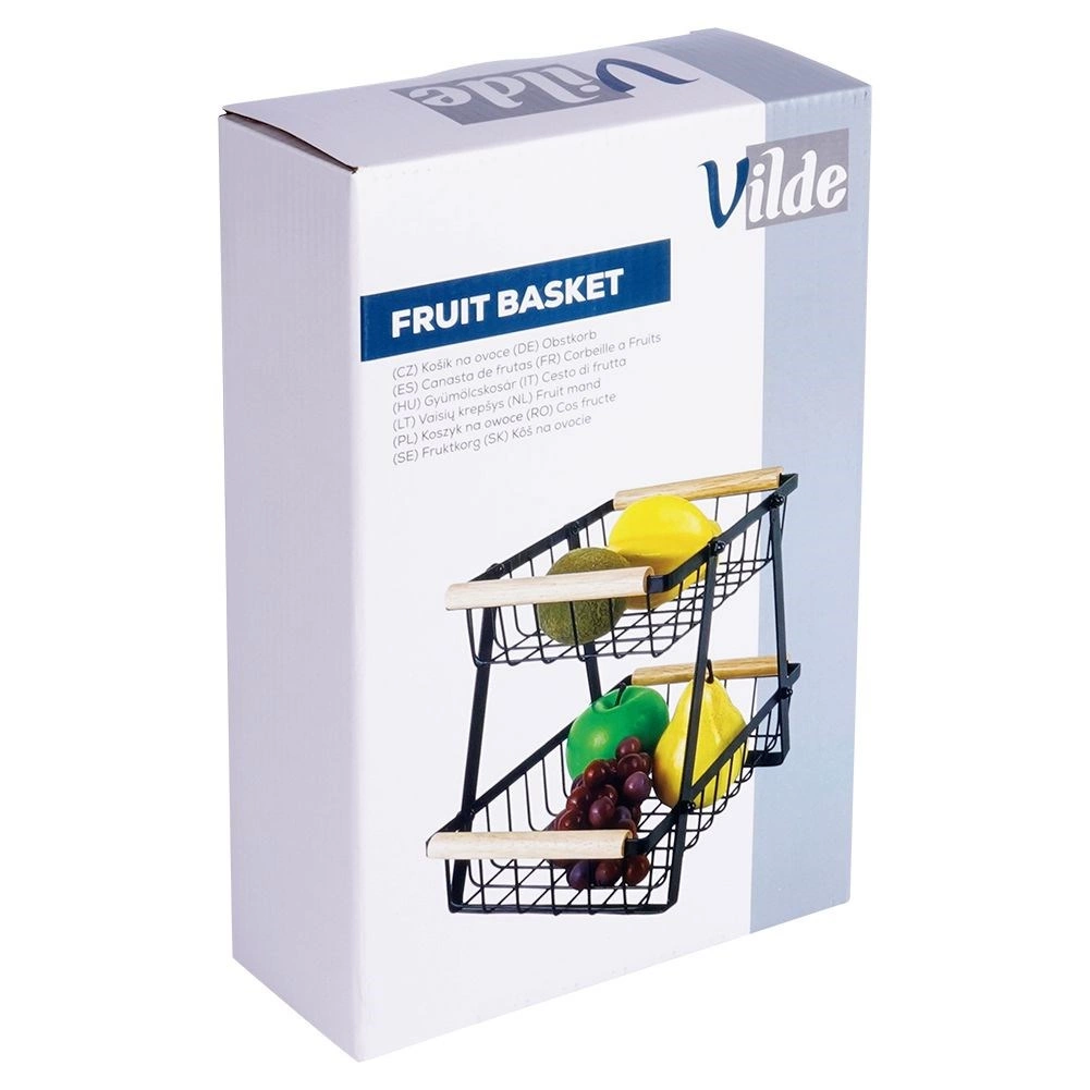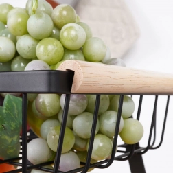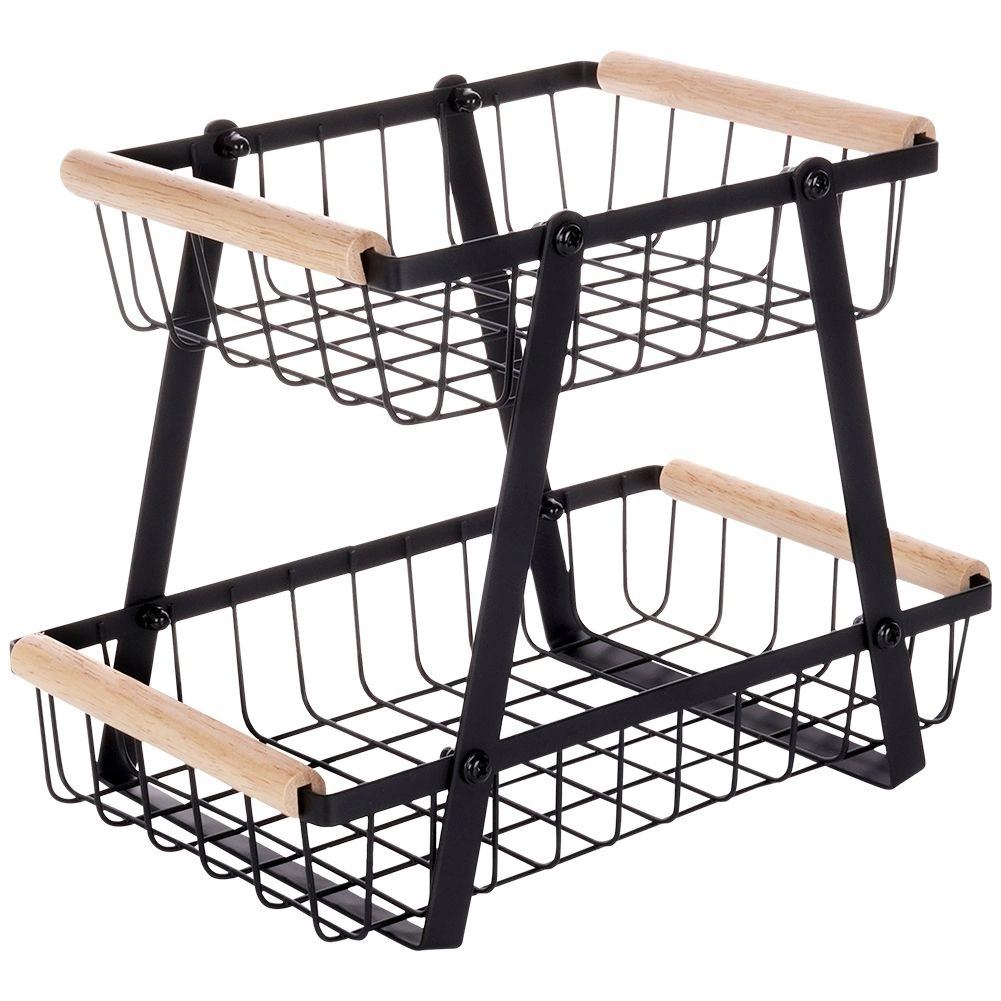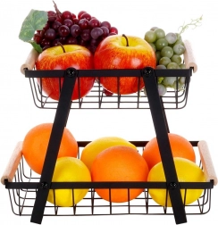 Praktikus, kétszintes gyümölcs- és zöldségtartó kosár fekete színben, fa fogantyúkkal, amely helytakarékos, kiváló légáramlást és stabil fém konstrukciót kínál. Ideális a konyhapultra vagy a kamrába a áttekinthető tároláshoz és az ételek stílusos kihelyezéséhez.