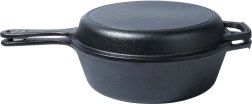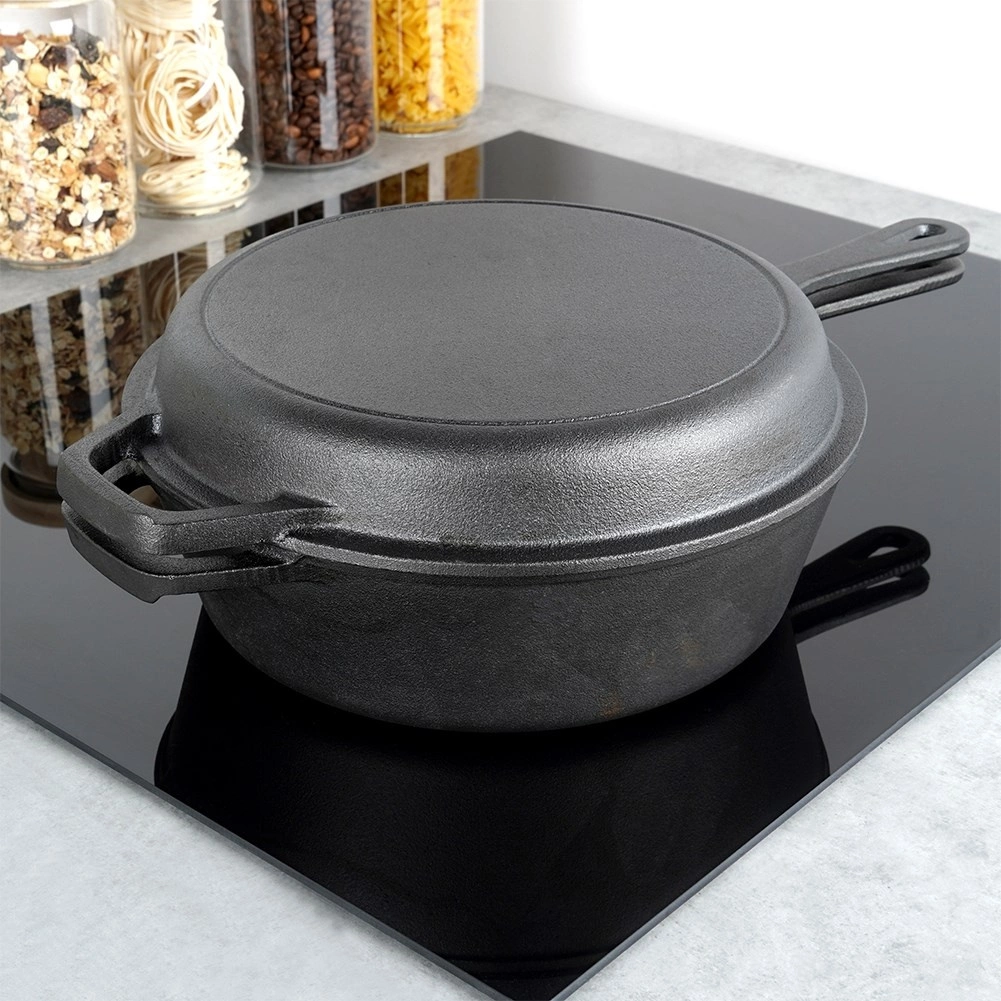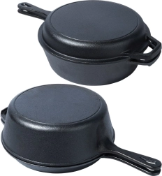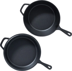 Masszív öntöttvas szett univerzális főzéshez: mély lábas és sekély serpenyő, amelyek tökéletesen illenek egymáshoz – a serpenyő fedőként is használható. Az öntöttvas biztosítja az egyenletes hőeloszlást, a hosszú hőtartást, és ideális sütéshez, pirításhoz és pároláshoz tűzhelyen, sütőben és nyílt láng felett is. Tartós kialakítás kettős fogantyúkkal, valamint gázzal, elektromossal, kerámiával és indukcióval is kompatibilis – megbízható társ minden konyhában és kempingben.