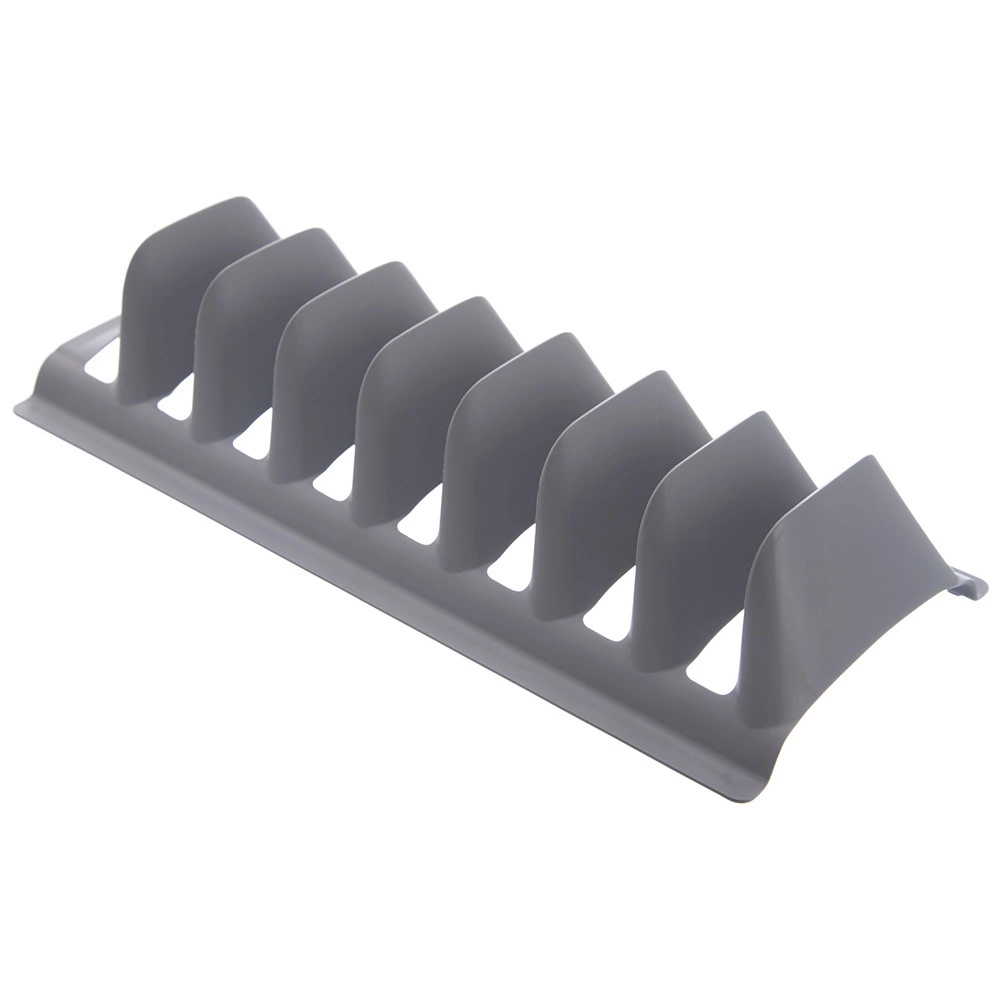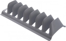 Praktikus konyhai rendszerező, amely függőleges helyzetben, áttekinthetően tartja a fedőket, tányérokat és vágódeszkákat. Akár 8 darabot is befogad, könnyű és tartós, minőségi műanyagból, univerzális szürke színben. Használható a pulton, szekrényben vagy mély fiókban, és mosogatógépben mosható.