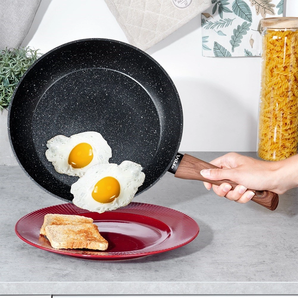 Stílusos, 28 cm átmérőjű gránit serpenyő mindennapi főzéshez. A tapadásmentes kőhatású felületnek, a gyors és egyenletes hőelosztásnak, valamint a fa hatású ergonomikus nyélnek köszönhetően egészséges ételeket készíthet minimális zsiradékkal minden tűzhelytípuson, beleértve az indukciót is.