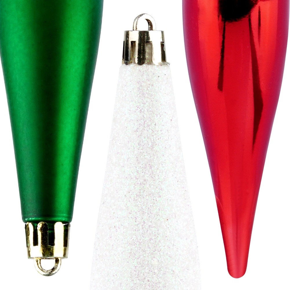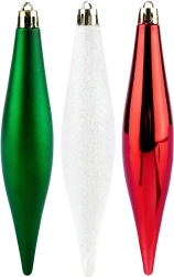 Elegáns, négydarabos karácsonyi díszkészlet csepp alakban, piros, zöld és fehér színekben, amely ragyogó fényt és ünnepi hangulatot kölcsönöz dekorációdnak. A díszek törhetetlenek, könnyűek és biztonságosak gyermekes vagy háziállatos otthonokban is. A fényes, matt és csillogó felület kombinációja stílusos változatosságot biztosít a fára, koszorúkra és girlandokra.