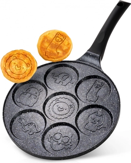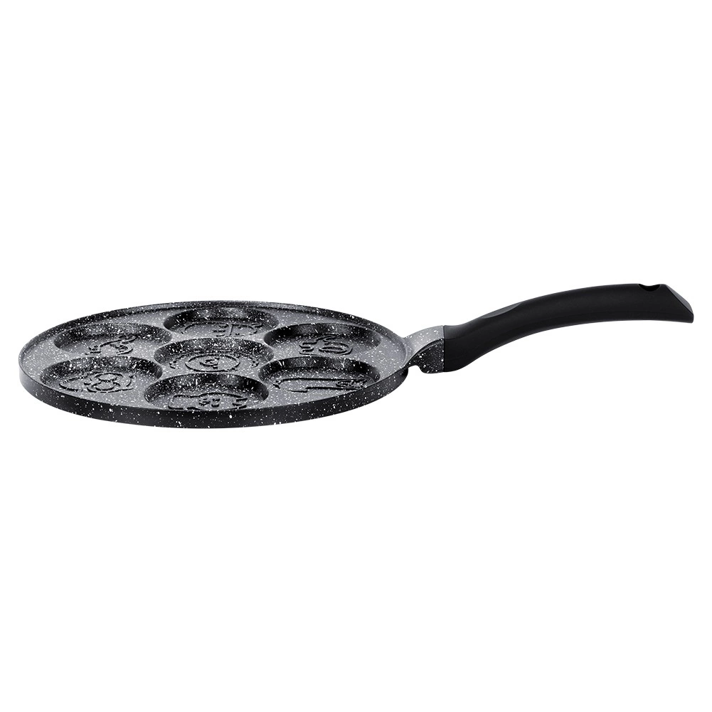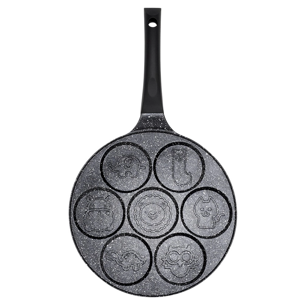Vidám, erőfeszítés nélküli reggelik: ez a 26 cm átmérőjű gránit serpenyő 7 darab, 8 cm átmérőjű formával tökéletesen kerek palacsintákat vagy tükörtojásokat készít aranyos állatmintás domborlatokkal. A tapadásmentes gránit bevonatnak köszönhetően minimális olaj is elég, a egyenletes hőeloszlás garantálja az egyenletes átsülést, a Soft Touch nyél pedig biztonságos és kényelmes fogást biztosít. Alkalmas minden típusú tűzhelyhez, beleértve az indukciósat is, és mosogatógépben mosható.