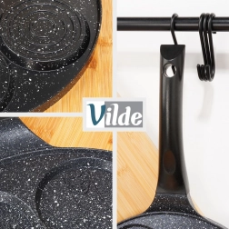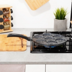 Praktikus gránit serpenyő tojásokhoz és palacsintához 7 kör alakú formával, 8 cm átmérővel a tökéletesen kerek alakért. Tartós alumínium test tapadásmentes gránit bevonattal, amely lehetővé teszi a főzést minimális olajjal. Ergonomikus nyél akasztónyílással, egyenletes hőelosztás a gyors és energiatakarékos sütéshez. Alkalmas gáz-, elektromos és üvegkerámia főzőlapokra, valamint mosogatógépbe.