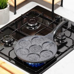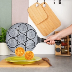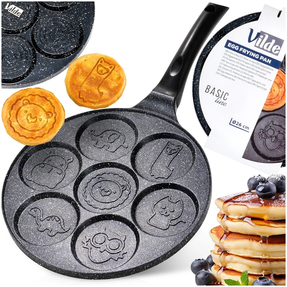 Ez a stílusos, hét formával ellátott serpenyő ideális tojás, palacsinta és mini palacsinta készítéséhez vidám állatfigurás dombor mintákkal. A tapadásmentes gránit felület könnyű ételkioldást és egyszerű tisztítást biztosít, míg az alumínium test gyors és egyenletes hőelosztást nyújt.