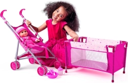 Ez a gyönyörű készlet mindent tartalmaz, amire gyermekének szüksége van kedvenc babájáról való gondoskodáshoz. Tartalmaz egy sport babakocsit fémvázzal, amely rendkívül praktikus a könnyű kezelhetőség miatt. Ezen kívül egy utazó kiságy is mellékelve van, amely otthoni és kültéri játékra is ideális.