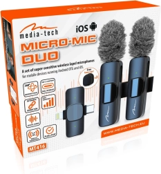 A Media‑Tech MICRO‑MIC DUO MT416 két csíptetős mikrofonból álló professzionális vezeték nélküli szettje kristálytiszta hangot, 360°‑os mindenirányú felvételt, AI zajszűrést és azonnali Plug & Play csatlakozást kínál USB‑C és Lightning csatlakozós telefonokhoz. Ideális videókhoz, podcastokhoz, interjúkhoz és livestreamhez, mobilis szabadsággal és megbízható, akár 35 m hatótávval.