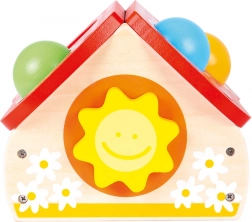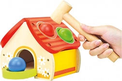 Ez a minőségi, fából készült játék vidám házikó formában ragadja meg a gyerekek figyelmét élénk színeivel és egyszerű játékmechanikájával – a tető nyílásaiba helyezett golyókat a kalapáccsal finoman be lehet ütni. A játék támogatja a motorika, a türelmet és a pontosság fejlődését.