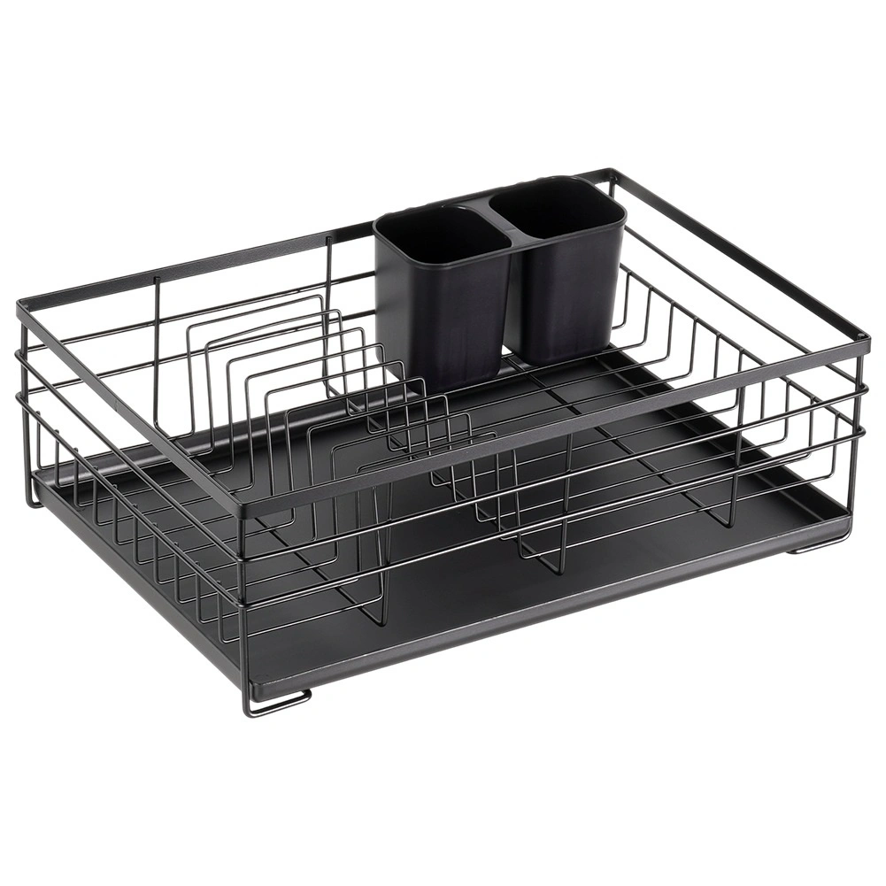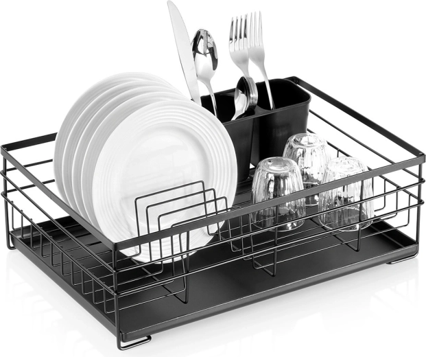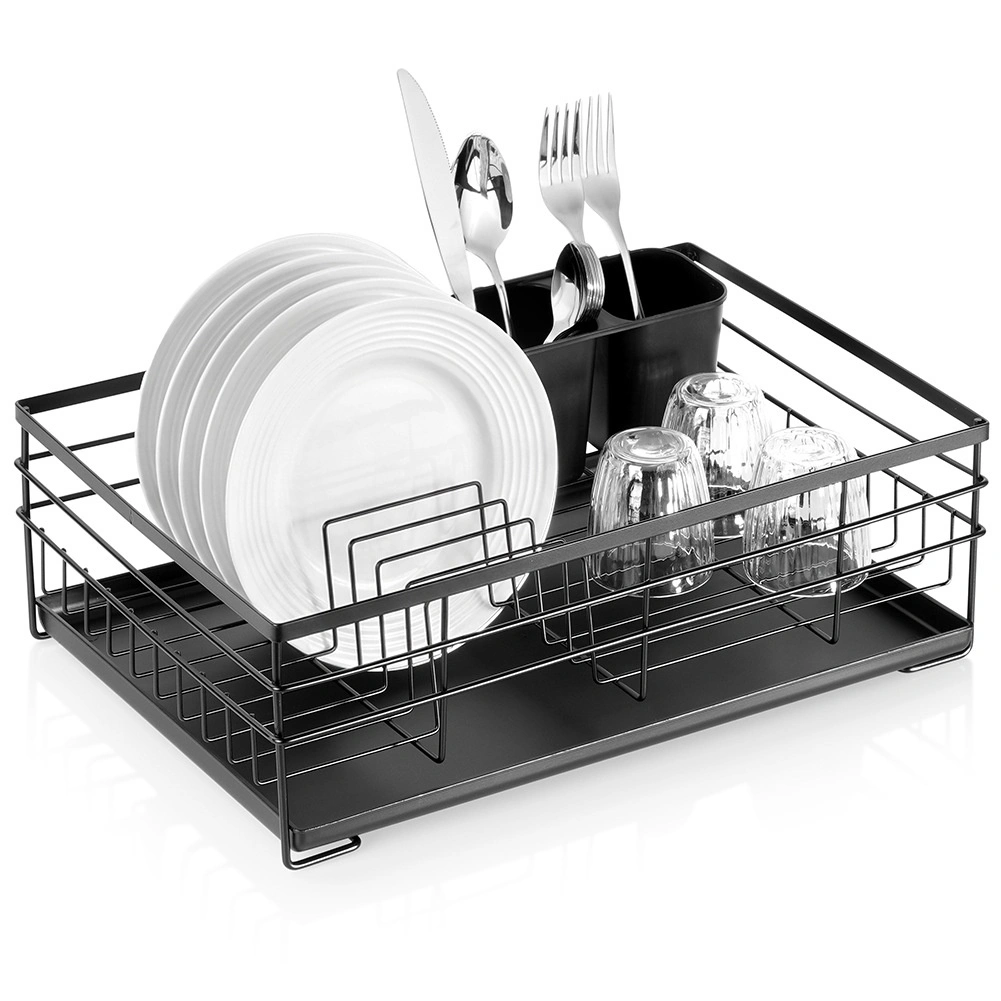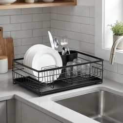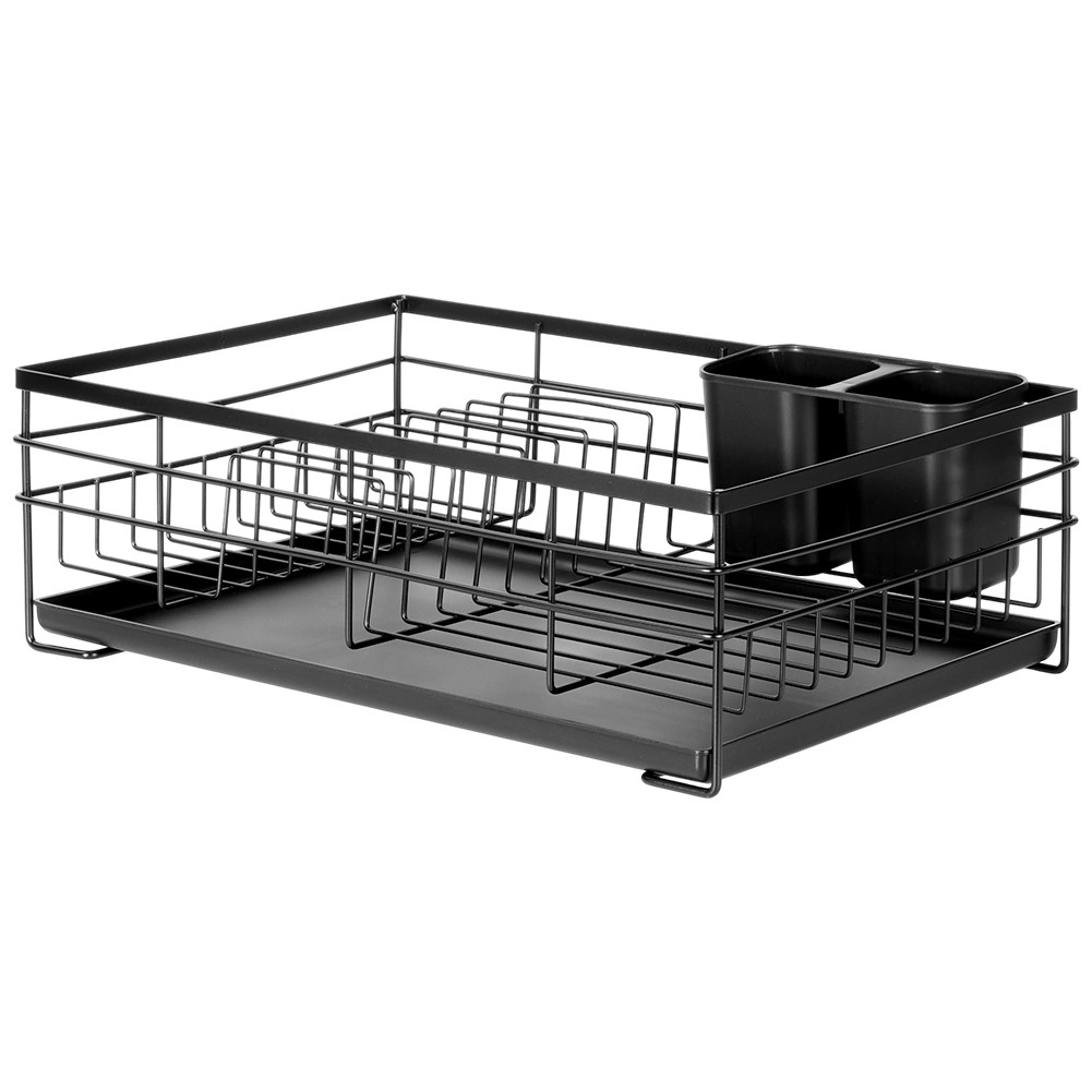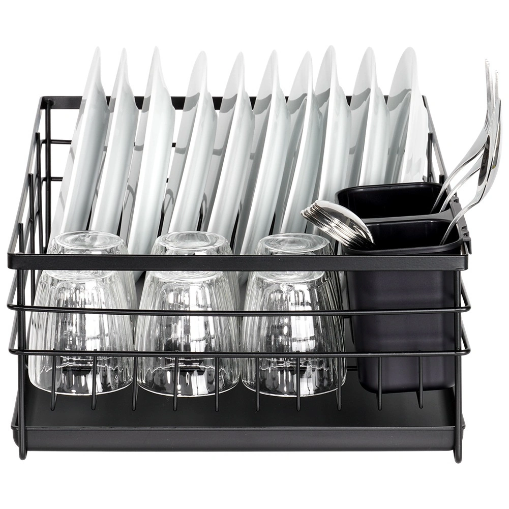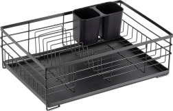 Praktikus és stílusos fekete edényszárító az áttekinthető szárításhoz tányérokhoz, poharakhoz és evőeszközökhöz. Nagy kapacitást, tartós fém szerkezetet és kivehető csepegtetőtálcát kínál, amely megóvja a konyhapultot a víztől.