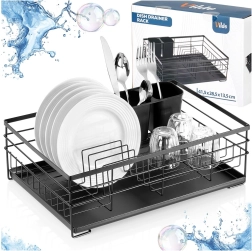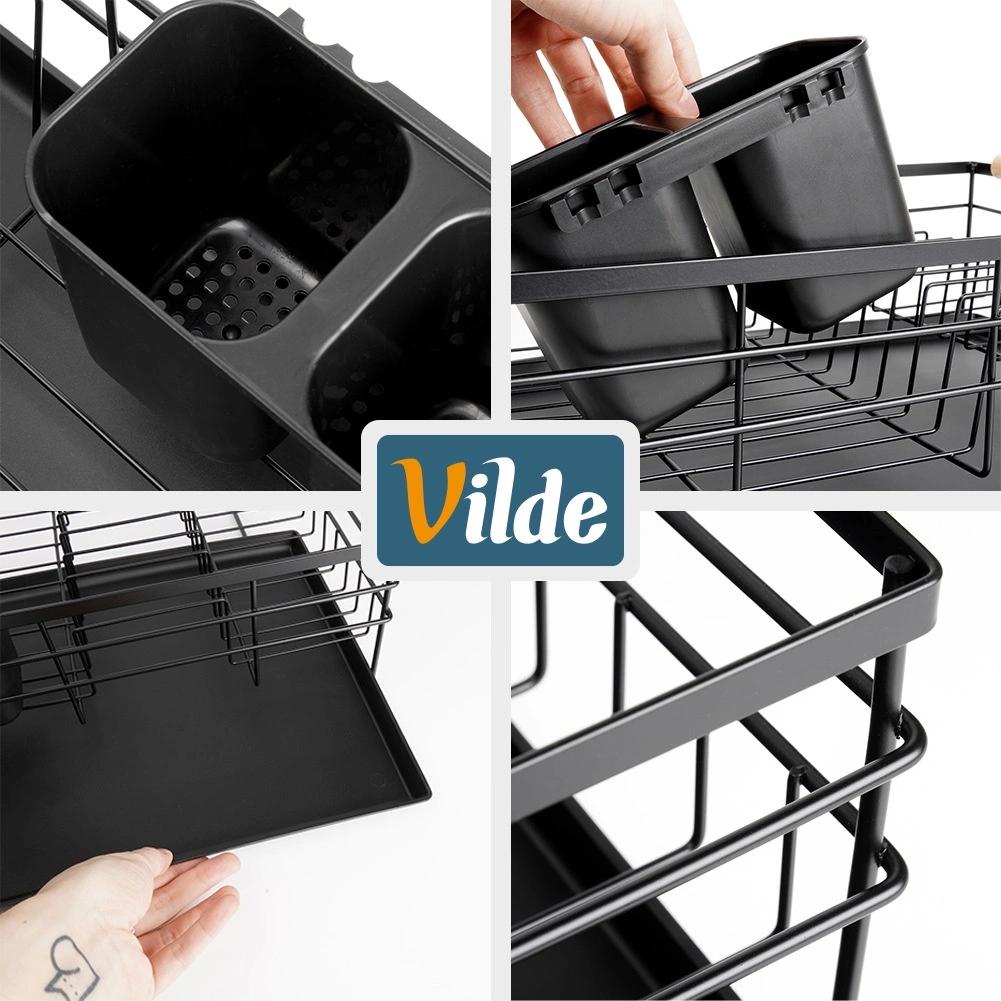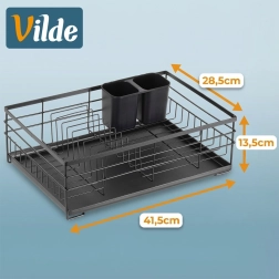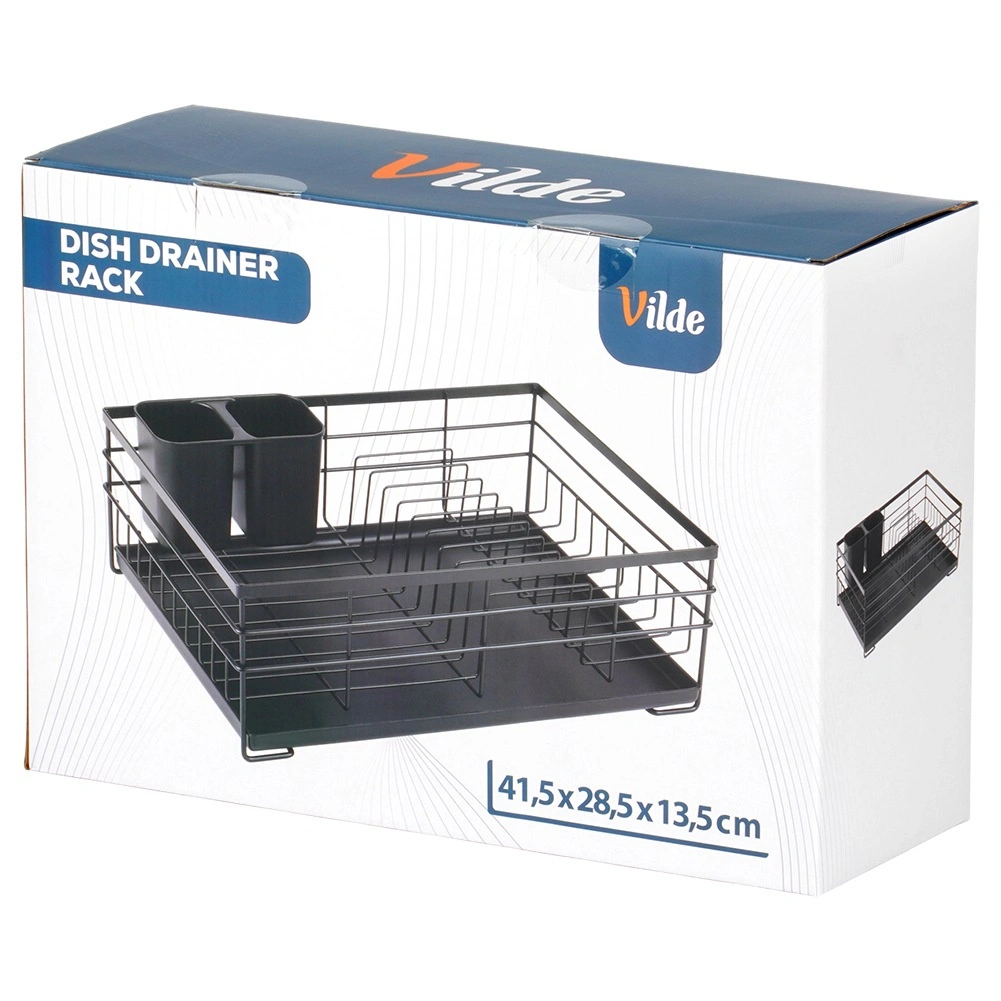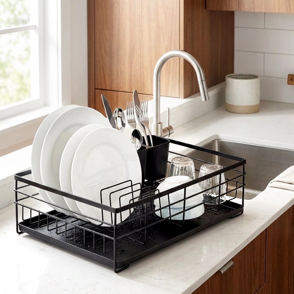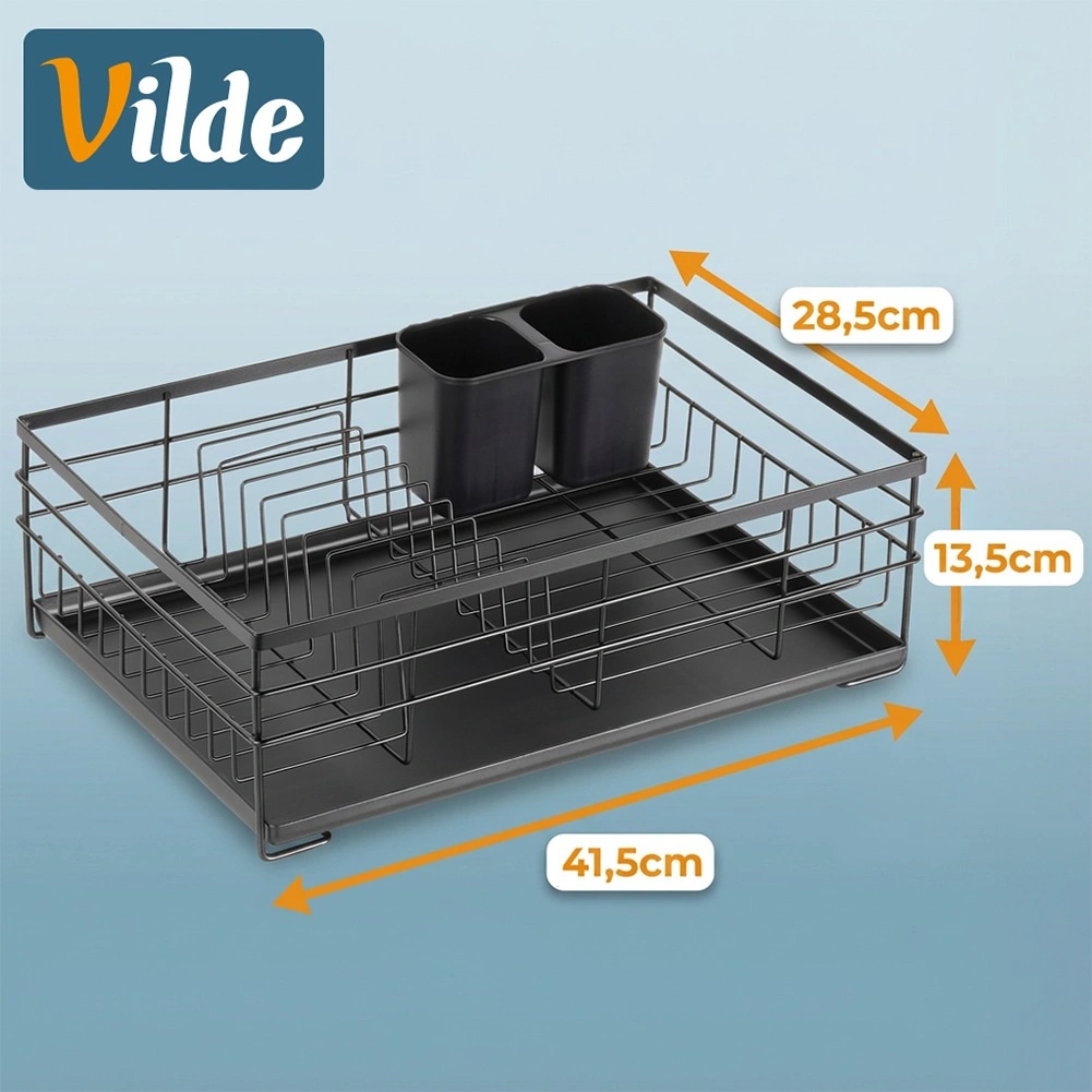 Praktikus és stílusos fekete edényszárító az áttekinthető szárításhoz tányérokhoz, poharakhoz és evőeszközökhöz. Nagy kapacitást, tartós fém szerkezetet és kivehető csepegtetőtálcát kínál, amely megóvja a konyhapultot a víztől.