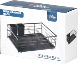 Elegáns, loft ipari stílusú edényszárító, amely tisztán és rendezettén tartja konyháját. A robusztus fekete fémkivitel, a kivehető műanyag csepegtetőtálca és a kétrekeszes evőeszköztartó kényelmes és higiénikus szárítást biztosít kézi mosogatás után.