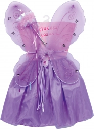 Ez a lila jelmez mesébe illő. Tüll-szatén szoknyából áll, derékon rózsadísszel, varázspálcával csillogó véggel és gyönyörű tündérszárnyakkal. A „gyöngy” nyaklánc és a finoman fénylő szalagok szépen kiegészítik a teljes öltözéket.