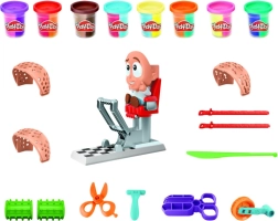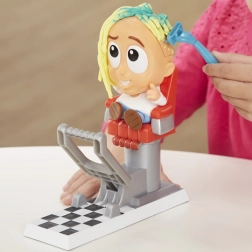 - Figura székkel, préselő alap, olló, fésű, formák, Play-Doh modellező gyurma tégelyek (több színben)