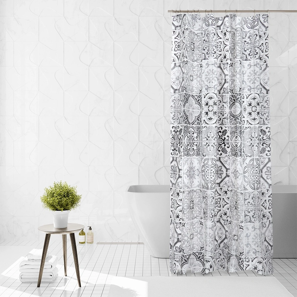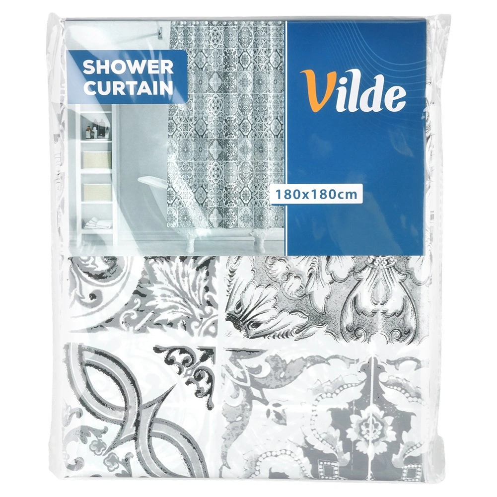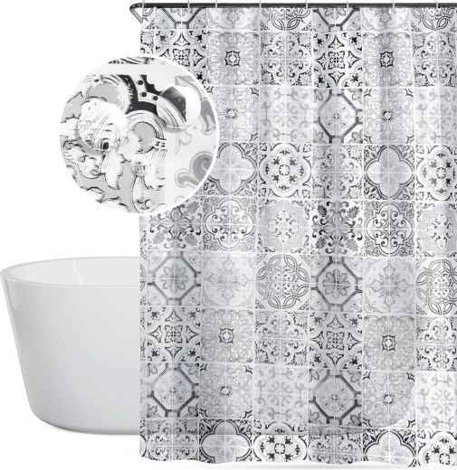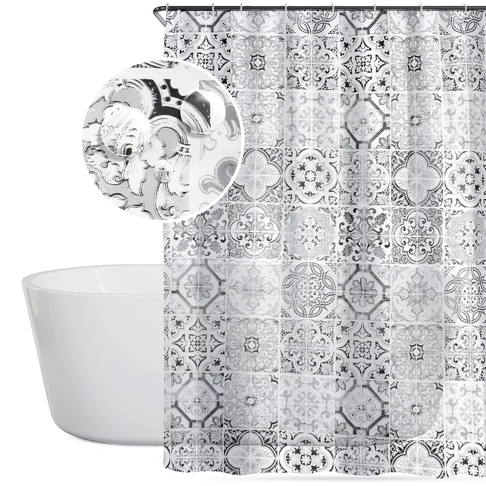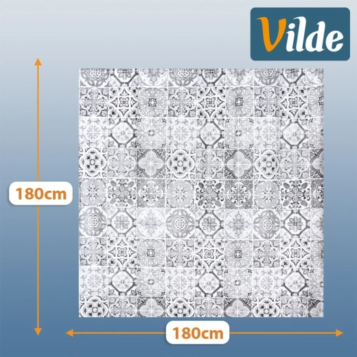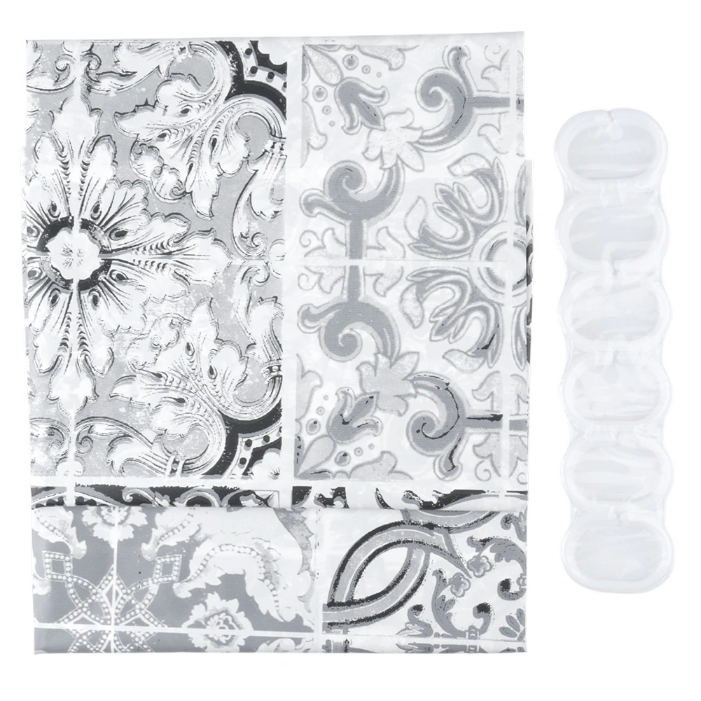Stílusos zuhanyfüggöny környezetbarát PEVA anyagból, 180 × 180 cm méretben, a csomagban 12 kampóval. Biztosítja a magánszférát, hatékonyan megakadályozza a víz fröccsenését, és a vízlepergető felületnek köszönhetően könnyen tisztítható. A modern szürke-fehér, csempék által inspirált minta elegáns megjelenést kölcsönöz a fürdőszobának.