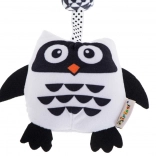 A függő játék bagoly formájú és puha, kellemes anyagból készült, a legkisebb gyermekek igényeihez igazítva. A csipesz biztosítja a könnyű rögzítést a babakocsira, kiságyra vagy hordozóra. A különféle felületi textúrák révén a játék érintésére ösztönzi a gyerekeket. A csörgő és rezgő elemek hallásra ösztönöznek, míg a kontrasztos árnyalatok alkalmazása látásra serkent. A fekete-fehér dizájn a legjobb választás a csecsemőknek, akiknél még nem fejlődött ki teljesen a látás.