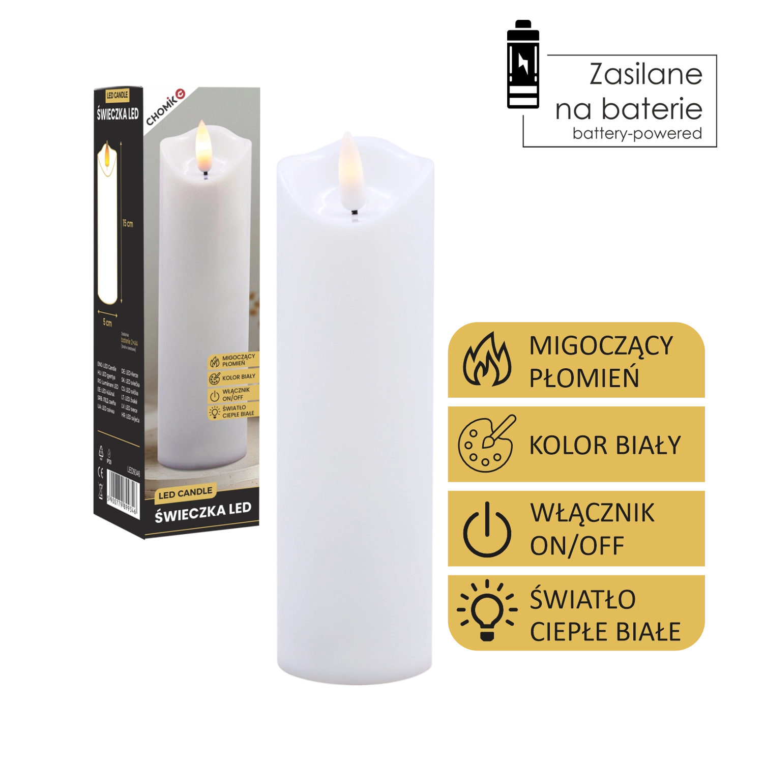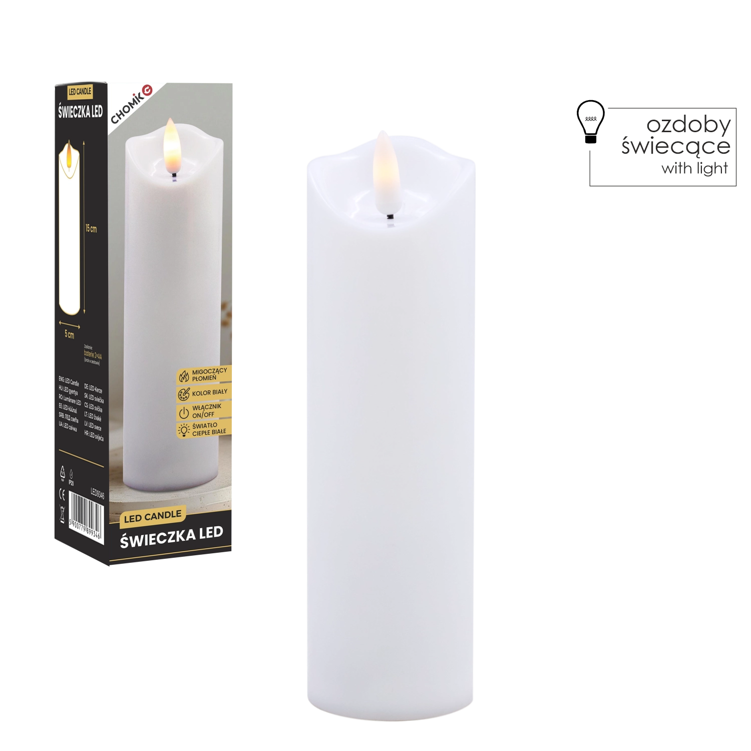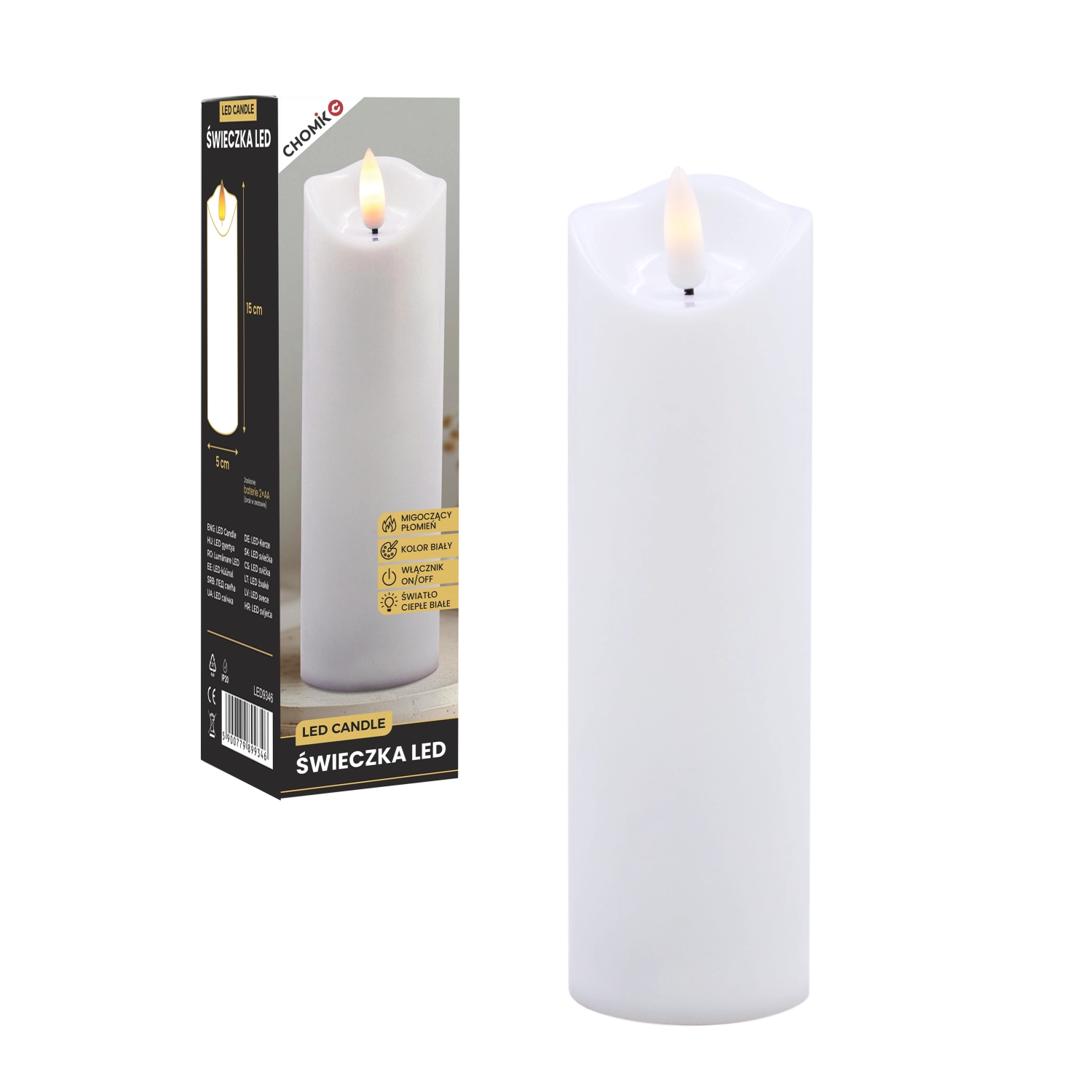 Elegáns fehér LED gyertya pislákoló, meleg fényű lánggal, amely füst és rendetlenség nélkül teremt meghitt hangulatot. Használható belső dekorációként, illetve betétként lampionba vagy lámpásba. 2× AA elemről működik (nem tartozék), az egyszerű On/Off kapcsoló pedig kényelmes használatot biztosít.