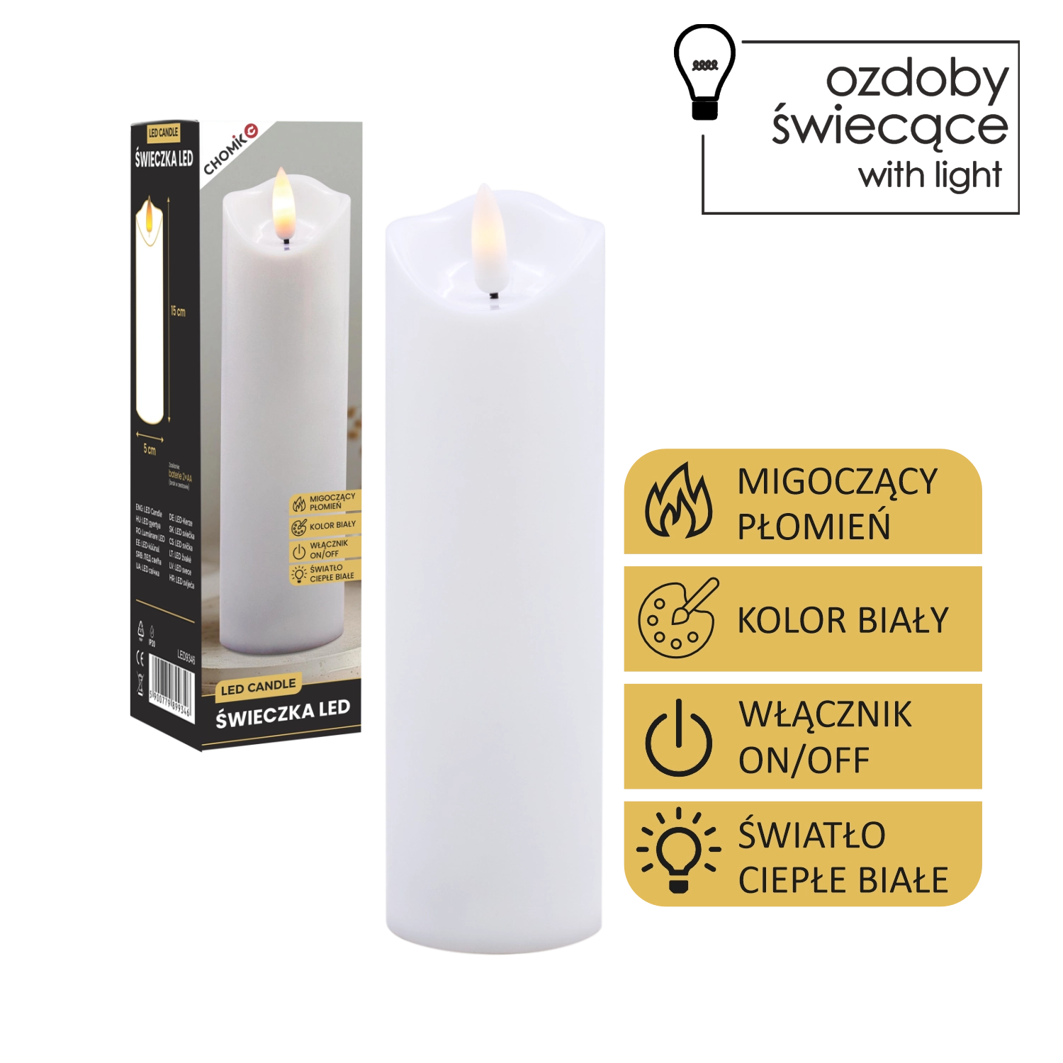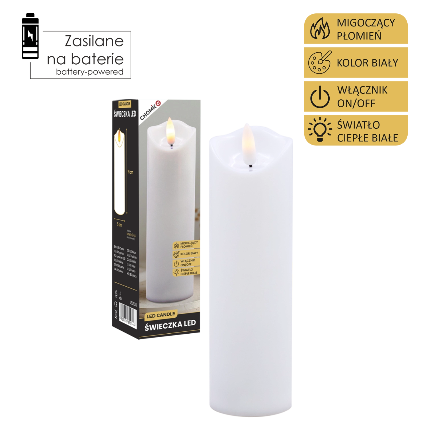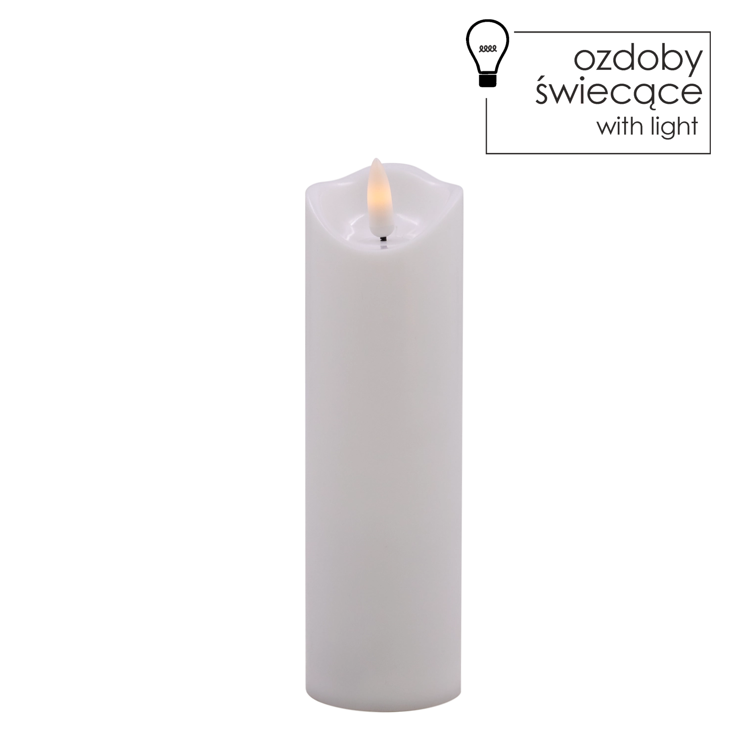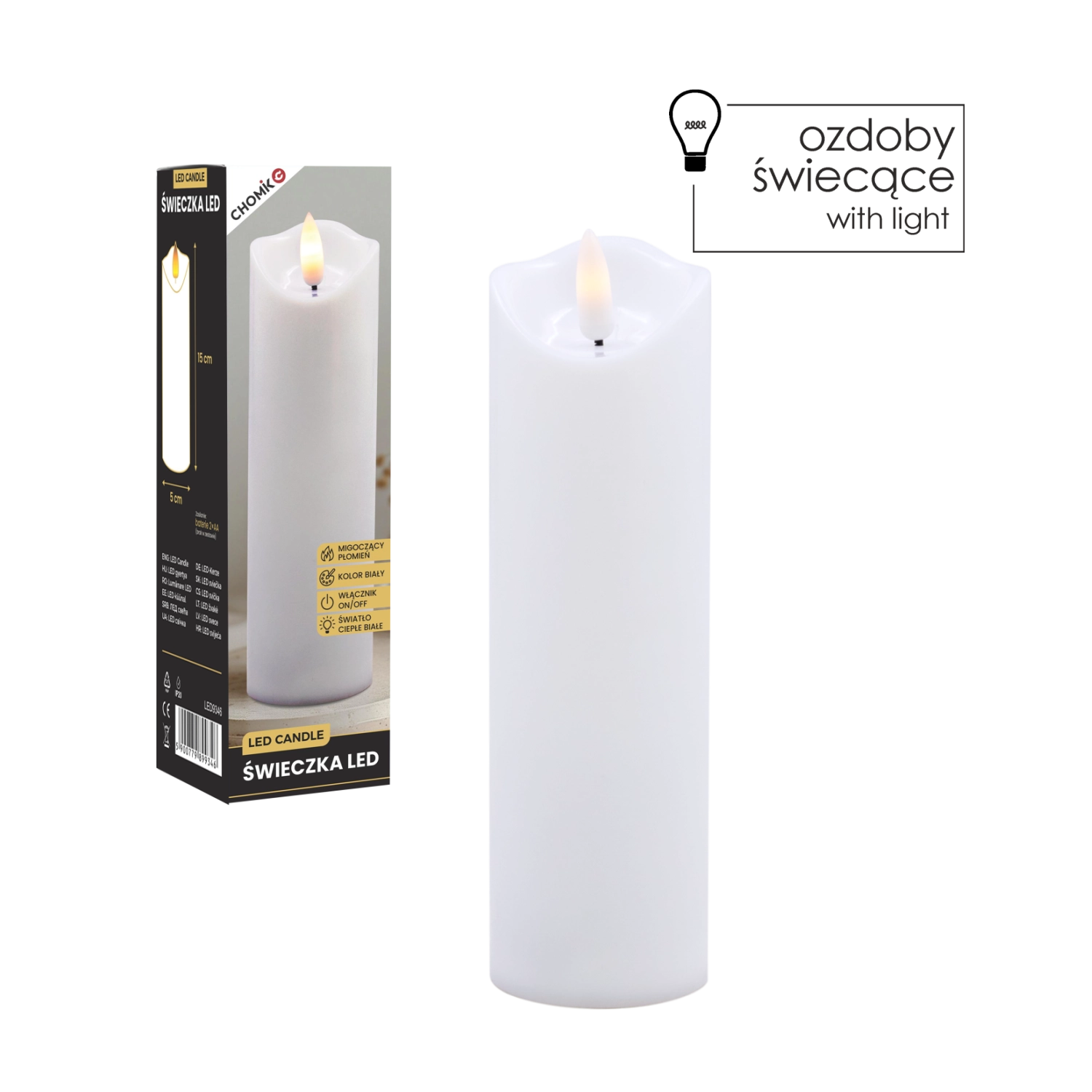 Elegáns fehér LED gyertya pislákoló, meleg fényű lánggal, amely füst és rendetlenség nélkül teremt meghitt hangulatot. Használható belső dekorációként, illetve betétként lampionba vagy lámpásba. 2× AA elemről működik (nem tartozék), az egyszerű On/Off kapcsoló pedig kényelmes használatot biztosít.