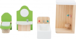 Stílusos babaház-fürdőszoba bútorkészlet, amely örömet szerez minden kis építőnek. Tartalmaz zuhanykabint, kádat, tükrös mosdót és WC-t friss zöld és natúr fa kombinációban. Tömör fából készült a hosszú élettartamért és a biztonságos játékért. Fejleszti a fantáziát és a finommotorikát, és alkalmas 12 cm-ig hajlítható babákhoz.
