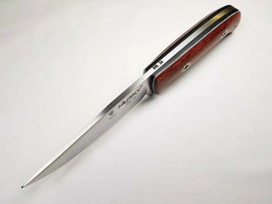 Az ergonomikusan formázott, rétegelt Pakka fa markolat kényelmes fogást biztosít hosszabb használat közben is. A zsinórlyuk további biztosítást tesz lehetővé. A csomag része egy fekete bőr tok a biztonságos és elegáns övtároláshoz.