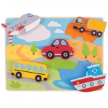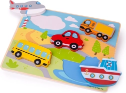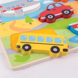 Fedezzétek fel a közlekedés világát játékos formában. A fa bedugós puzzle repülő, autó, autóbusz, teherautó és hajó motívummal segít a formák és színek felismerésében, miközben fejleszti a szókincset. Az elemek elég nagyok és kellemes tapintásúak a gyerekek kezébe.