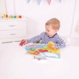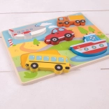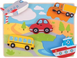 Szórakoztató fa bedugós puzzle a legkisebbeknek közlekedési eszközökkel. 5 nagy, fogantyús elemet tartalmaz, amelyeket a gyerekek könnyedén a megfelelő nyílásokba helyeznek. Támogatja a finommotorikát, a koordinációs készségeket, a formák és színek tanulását, valamint a szókincs fejlesztését. Minőségi fából készült, és megfelel az európai biztonsági szabványoknak.