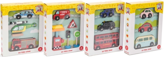 A Le Toy Van fa mentőautói lehetőséget adnak a gyerekeknek a képzeletbeli játékra. Három járművet tartalmaz - helikopter, rendőr- és tűzoltóautó, tartós gumi faanyagból készült, vízbázisú, nem mérgező festékekkel festve. Ideális ajándék fiatal tűzoltóknak, pilótáknak és rendőröknek.