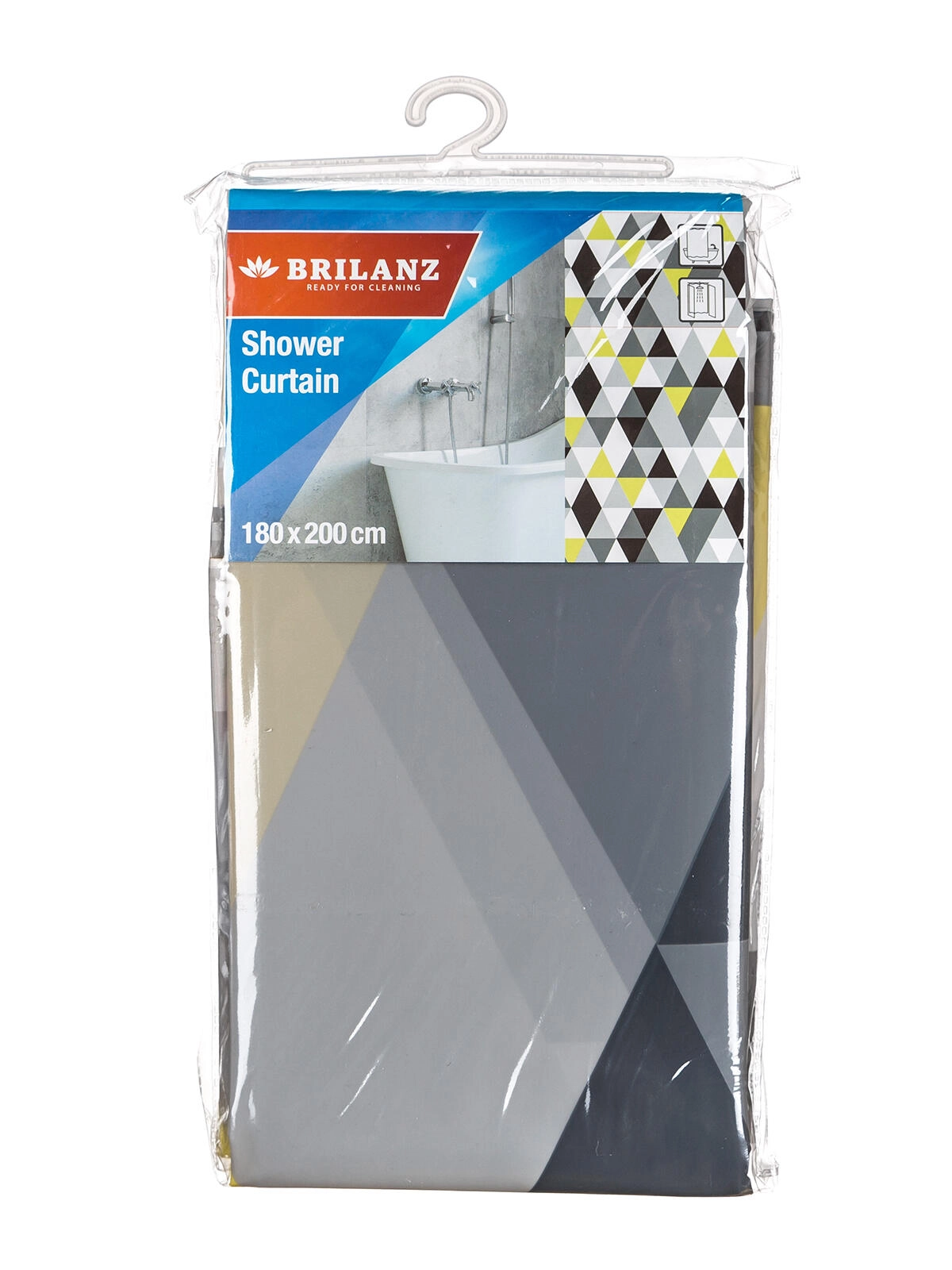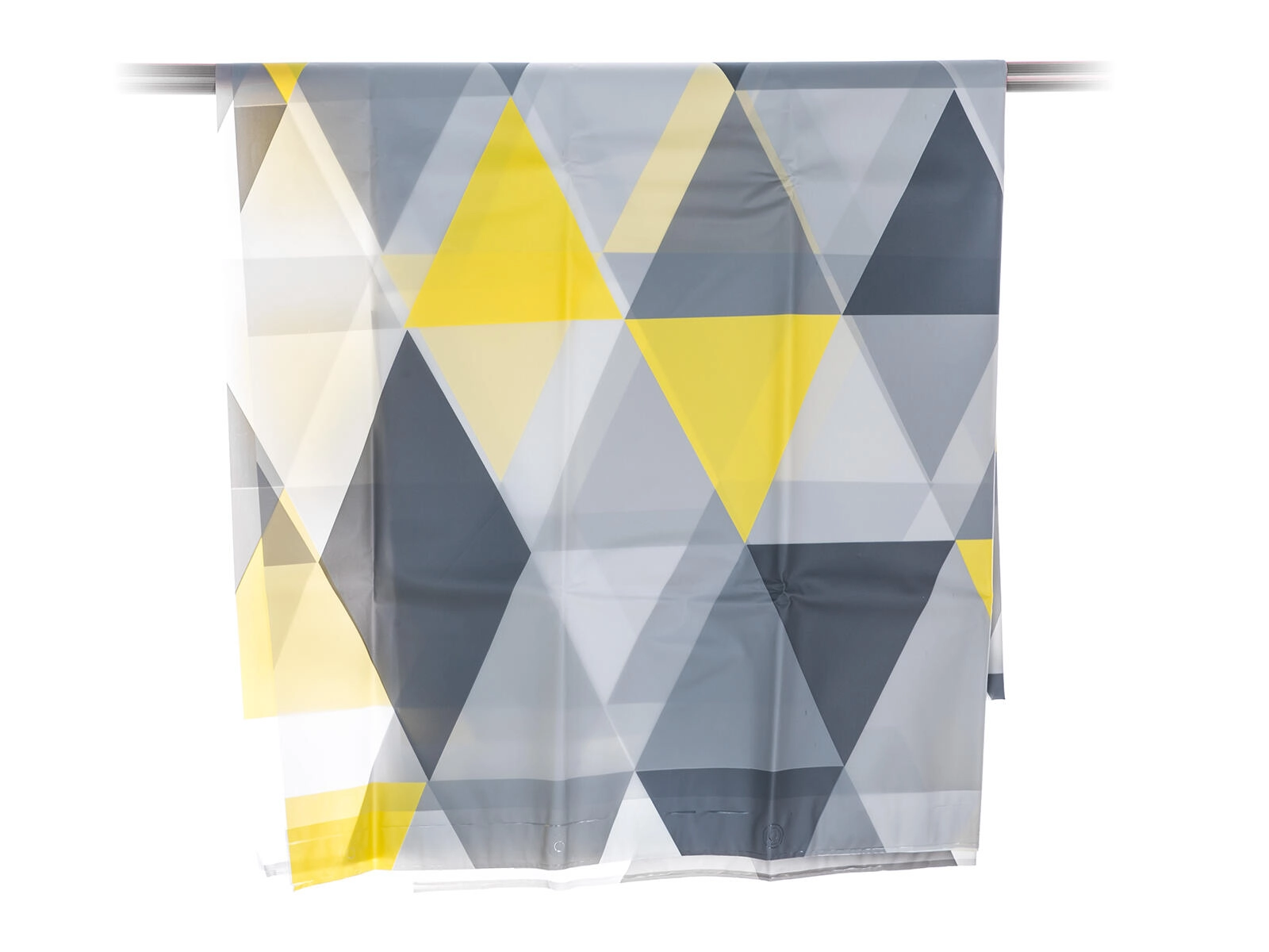 Stílusos zuhanyfüggöny szürke és sárga árnyalatú háromszög mintával, amely modern megjelenést kölcsönöz fürdőszobájának és megbízható védelmet nyújt a fröccsenő víz ellen. PEVA anyagból készült, amely vízálló, könnyen tisztítható és PVC-mentes. A praktikus 180 × 200 cm méret zuhanykabinokhoz és kádakhoz is passzol.