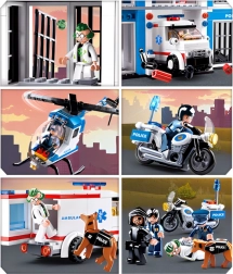 A készletben helikopter, rendőrségi motor és mentőjármű található. A gyerekek merész bevetéseket és gyors üldözéseket tervezhetnek, és izgalmas börtönszökés-jeleneteket alkothatnak.