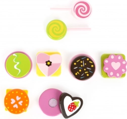 Ki tudna ennek ellenállni? Ez a színes édességkészlet 100% FSC fából készült nyalókákkal, kekszekkel és pralinékkal örvendeztet meg, amelyeket a tépőzáraknak köszönhetően újra és újra szét lehet szedni és össze lehet rakni. Remek kiegészítő a gyerekkonyhába, amely fejleszti a finommotorikát, és végtelen, játékos szórakozást kínál.