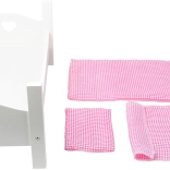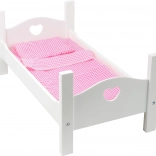 Ez a varázslatos fa babágy, amely akár 45 cm-es babákhoz vagy plüssökhöz is ideális, tökéletes kiegészítője minden gyerekszobának. Masszív szerkezetének és finom részleteinek, mint a fejrészen található szívecske kivágások, köszönhetően minőségi és hosszan tartó szórakozást nyújt. A praktikus szett párnát, takarót és lepedőt tartalmaz finom rózsaszín mintával, amely még élethűbbé teszi a játékot. A babágy minőségi fából készült, ami biztonságot és tartósságot garantál a játék során.