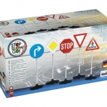 Az öt leggyakrabban használt tábla készlete (pl. STOP, Elsőbbségadás kötelező, Főútvonal, Kötelező haladási irány, Gyalogátkelőhely) segít a gyerekeknek gyorsan elsajátítani az alapvető szabályokat.