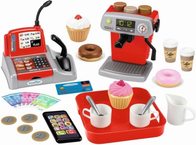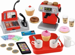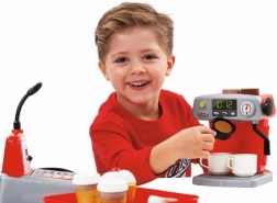 A kávézó játékkészlet ideális választás a kávé és szerepjátékok szerelmeseinek. Ez a stílusos portafilteres készülék lehetővé teszi három különböző kávéfajta elkészítését. Az ízletes italokat kis tálcán lehet felszolgálni, tartaletekkel vagy fánkokkal együtt. Létezik To Go verzió is, kis fedeles kávéspoharakkal.