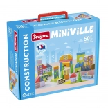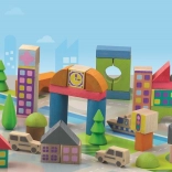 Ez a minőségi fa építőkészlet ideális választás az első építési projektekhez. A változatos formáknak és színes mintáknak köszönhetően a gyerekek könnyedén építenek házakat, utcákat és egy egész kis várost. A készlethez egyszerű fa járművek és egy játékalátét is tartozik, amelyek történetet adnak a játéknak és támogatják a fantázia fejlődését.