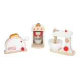 Ez a stílusos fa készlet három legnépszerűbb készüléket hoz a gyerekkonyhába: kenyérpirítót, kávéfőzőt és mixert. A valósághű funkciók, mint a kattintható vezérlők, a kenyérpirító kiugró karja és a mixer forgó habverője, ösztönzik a fantáziát, az önálló játékot és a finommotorika fejlődését.