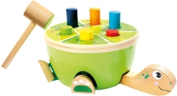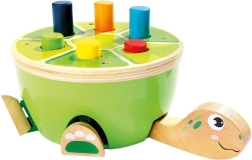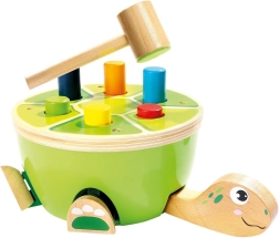 A Bino teknős kalapálójáték ideális választás az első motorikus játékokhoz. A gyerekek a puha, filcborítású fa kalapáccsal biztonságosan üthetik be a színes pálcikákat a páncélba. Játék közben természetesen fejlődik a finommotorika, a kéz–szem koordináció és a koncentráció, a vidám kivitel pedig hosszú időre leköti a figyelmet.